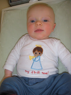 Austin turned 4 months old yesterday, December 9. Wow! His doctor's appointment is on Tuesday so I will post his stats after that. He is still trying really hard to roll over and loves to grab his feet. He likes looking in the mirror and smiling at himself at school. He moves all over the place in his crib at night; just not onto his tummy yet. He grabs onto blankets or burp clothes when they are over him. He is growing like a weed. He is mostly wearing 6 month clothes now. It seems like he is tall because he outgrows clothes because they get too short. Here are a few pictures in his "first noel" t-shirt that Aunt Ricki gave him.